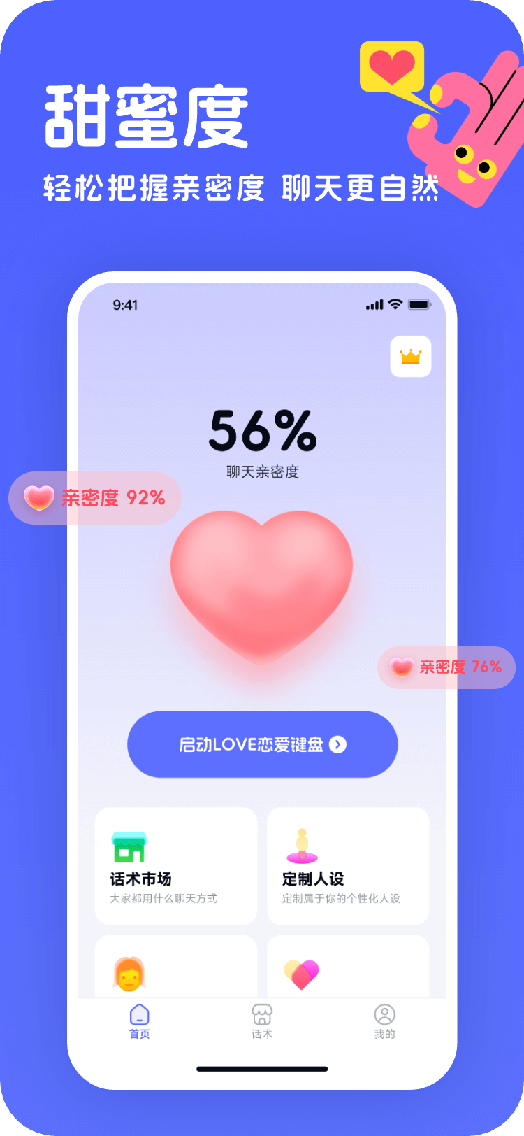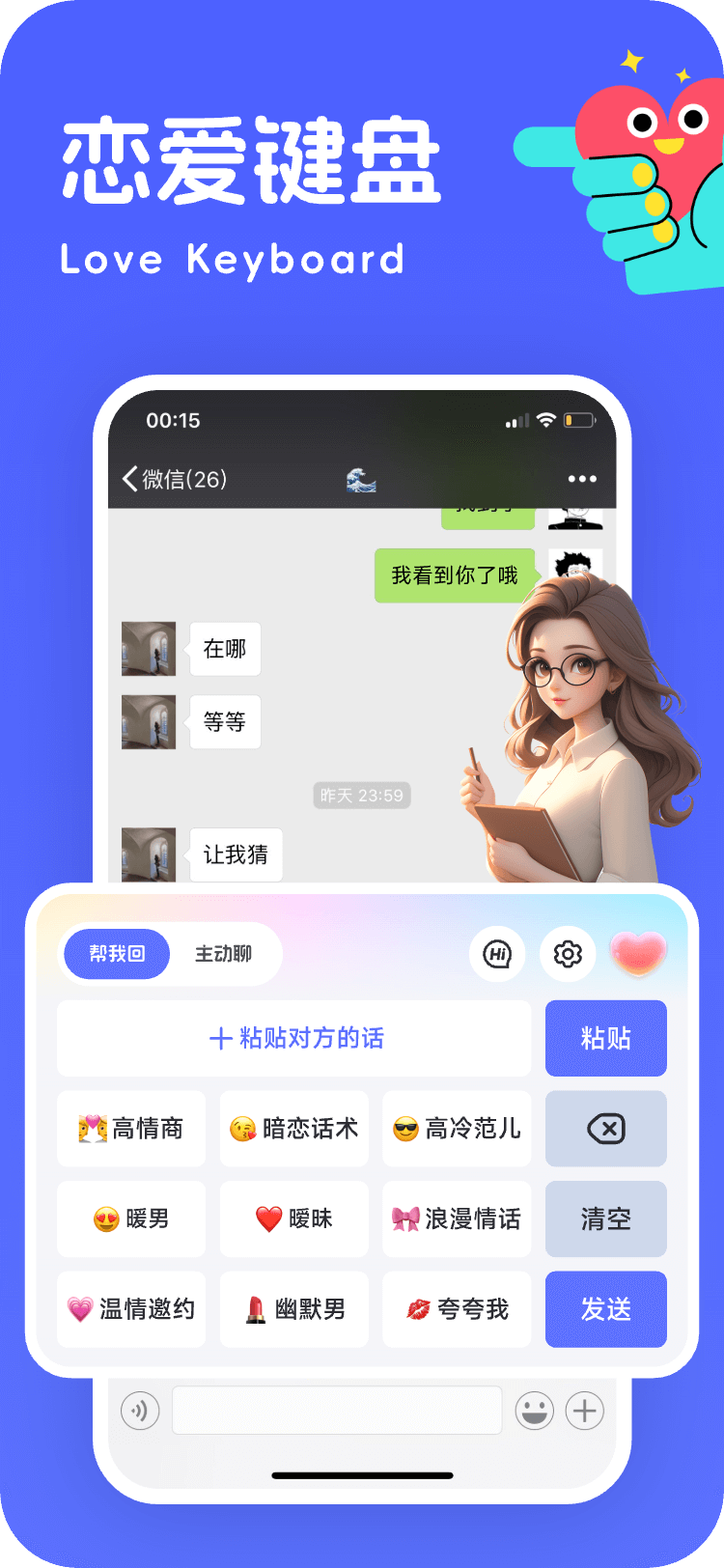love恋爱聊天键盘Love恋爱聊天键盘”是一款专为恋爱场景设计的智能聊天助手,它能根据不同的聊天情境智能推荐暖心回复、俏皮情话和深情表白,无论是初次搭讪、日常调情还是节日表白都能轻松应对。App Store下载